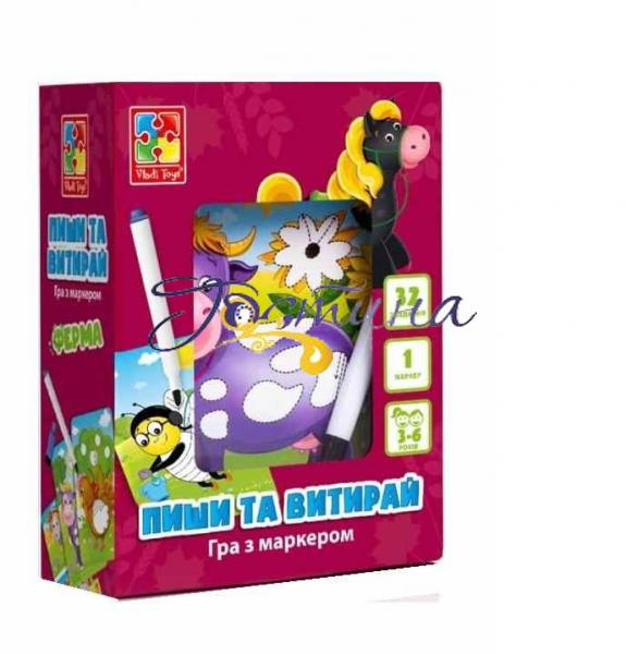 У наборі Пиши та витирай ви знайдете ребуси, розмальовки, штрихування та багато іншого. А тваринні ферми зроблять грально-навчальний процес ще цікавішим! Виберіть картку. Уважно її розгляньте та виконайте завдання за допомогою маркера. Потім витерти маркер губкою та написати знову! Наприклад: допоможіть собачці пройти через лабіринт до його будиночка. Якщо ви переплутаєте шлях, просто зітріть старі написи та спробуйте ще раз!