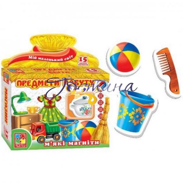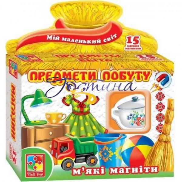 Настільна гра Vladi Toys Предмети побуту - м'ясного які магніти, які допоможуть розширити кругозір і словниковий запас дитини, співвіднести назву об'єкта з його зображенням. Їх легко кріпити на магнітну поверхню, за рахунок обсягу їх зручно брати в руку і легко переміщати з місця на місце.