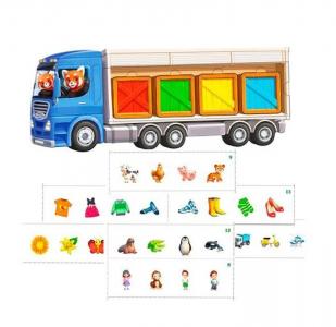 Наші панди-далекобійники перевозять різні вантажі: побутову техніку, меблі, тварин, одяг, інструменти та інше. 1-й варіант гри: допоможіть пандам знайти 4-го зайвого на кожному завданні. Наприклад: серед домашніх тварин знайти дику або серед овочів - фрукт. Проговорюйте з дитиною назви кожного предмету. Що об'єднує інші предмети? Як їх можна назвати одним словом? 2-й варіант гри: використовуйте плашки, щоб пограти з дитиною в меморі. Закрийте предмети і попросіть дитину назвати де і що заховано. 1. Розвиток логічного і понятійного мислення 2. За допомогою такого методичного матеріалу, діти пізнають навколишній світ. 3. Розвивається дрібна моторика. Вставляючи певним чином детальки, чудово тренуються пальчики. 4. Працює зорова пам'ять, тренується увагу і посидючість.