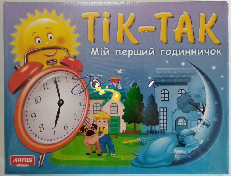 «Тік-так» — це навчально-розвиваюча гра, котра в легкій ігровій формі допоможе вашому малюку навчитись визначати час по механічному та електронному годинниках. В залежності від вікового та індивідуального розвитку дитини, пропонується відразу декілька варіантів гри. Діти почнуть орієнтуватися в часі доби, співвідносити свій розпорядок дня з показами годинника. Для цього використовується 15 картонних карточок, кожна з яких складається з двох елементів. На лівих половинках зображені щоденні моменти з життя дітей і цифровий годинник, котрий показує час, коли відбувається подія. Відповідний час показує годинник зі стрілками на правих елементах карточок. У грі присутній великий циферблат зі стрілками, що рухаються, а також великий планшет, де малюки будуть мати змогу виставляти час цифрами, як в електронному годиннику. Завдяки карточкам-завданням, навчаться вірно називати і виставляти годину, як на циферблаті зі стрілками, так і на планшеті електронного годинника. Також, за допомогою спеціальних жетонів-годинничків,  малята навчаться рахувати пройдений час. Комплектація Тік-так. Мій перший годинник ArtosGames:15 карточок з малюнками (30 елементів)циферблат зі стрілкамипланшет для відображення часу електронного годинника32 цифри для позначення часу на електронному годиннику2 жетони (ранок (день) та вечір (ніч))8 жетонів-годинничків32 картки-завданняправила гри
