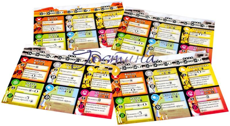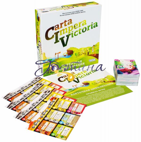 «CIV. Carta Impera Victoria »- це карткова настільна гра - філлер, в якій гравцям потрібно побудувати свою цивілізацію, розвиваючи науку, релігію, культуру, військову справу та інші сфери Ігровий процес не тільки простий, але і дуже елегантний. Партія триває протягом трьох епох, які по черзі змінюють один одного. Для цього всі карти діляться на відповідні епохи, і викладаються стопкою, де внизу знаходяться карти третьої епохи, посередині - другої, ну а на самому верху розташовуються карти першої епохи. Крім того всі карти поділені на шість різних кольорів і кожен колір символізує певну сферу: помаранчевий, наприклад - військова справа, жовтий - економіку, зелений -науку, сірий - релігію, синій - культуру, а червоний - утопію. На самому початку партії гравці отримують по три карти першої епохи, і власне готові починати. Мета гри - розвинути хоча б одну сферу до 7 (або 8, залежить від кількості гравців) рівня. відеоогляд https://youtu.be/cxB4ATwn3pg У свій хід гравець викладає перед собою одну карту, а потім застосовує ефекти різних груп, якщо звичайно у нього є можливість це зробити. Саме в ефектах карт полягає вся суть гри, оскільки активуючи карти різних сфер, ви можете здійснювати стратегічні ходи.Гра закінчується коли хто-небудь з гравців виставить на стіл певну кількість карт однакової сфери, або коли вичерпається колода епох. Якщо при цьому ніхто не закінчив гру тотальним домінуванням, то перемогу здобуває гравець, якому вдалося набрати найбільшу кількість переможних очок за домінування в окремих сферах.Ефекти бувають двох типів - постійний і скидання. Постійний ефект можливо розіграти тільки при наявності певної кількості карт даної сфери, а ефект скидання можна виконати, скинувши 1 карту з вашої ігрової зони. Завдяки використанню ефектів ви зможете продуктивно маніпулювати доступними картами, добираючи нові з колоди, збільшуючи кількість доступних на руці карт або навіть заважаючи суперникам розвивати деякі сфери.«CIV. Carta Impera Victoria »це чудова мініатюрна цивілізація, партії в яку займають не більше 15-20 хвилин, і при цьому, насправді занурюють вас в будівництво справжньої держави, яке проходить червоною ниткою крізь історичні епохи. Тут ви знайдете і стратегічну глибину, і чудову взаємодію між гравцями, стильний, приємний арт, і без сумніву захоплюючі партії!