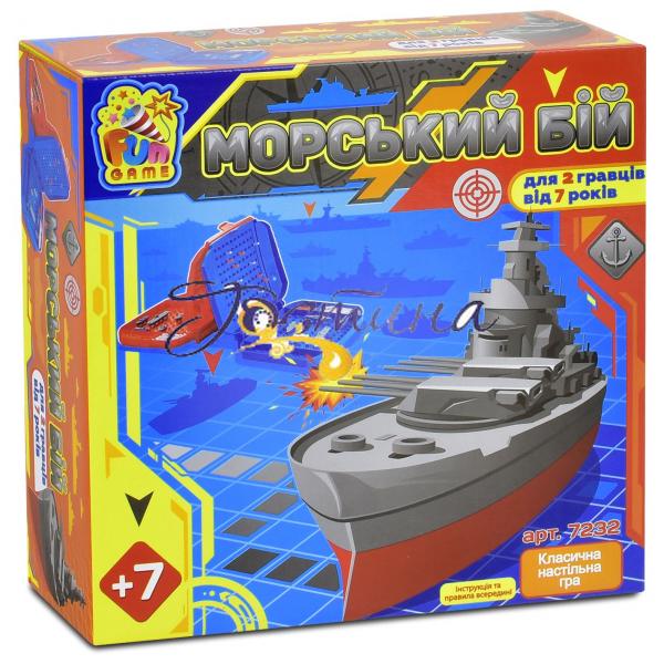 За допомогою ігрового поля дитина легко зорієнтується в правилах гри, а зручні місця для зберігання фішок і наочні фігурки кораблів вдосконалюють і так захоплюючий сюжет гри 'Морський бій'.Набір Морський Бій 7232 від Fun Game містить в собі 2 ігрових платформи, червону і синю, два набори кораблів і фішки-постріли.На одній частині панелі необхідно в випадковому порядку (вертикально або горизонтально) встановити свій флот з 5 кораблів. Друга ж частина кожної з панелі призначена для твоїх пострілів. Червоні і білі фішки, які входять в набір, діляться порівну і призначені для визначення на ігровому полі промахів (білі) і влучень (червоні) як під час своїх, так і під час чужих ходів. У комплекті: 2 ігрових поля;10 кораблів;84 червоних фішок;168 білих фішок;інструкція і правила гри (українською мовою).Особливості настільної гри Fun Game Морський бій: розмір: 24х18х5 см;розмір упаковки: 26х8х27 см;вік: від 7 років;матеріал: пластмаса.