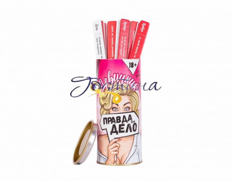 Зібралися дівчинки, обговорили життя, хлопців, дітей, роботу ... ну і що потім? А потім вам варто зіграти в «Правда чи ліло: Дівич-вечір». Ви точно надовго запам'ятаєте цей вечір, тому що ризикуєте померти від сміху або, як мінімум, почервонієте від відвертостей. А можливо наша гра навіть допоможе вам завести дуже цікаві знайомство або навпаки - втратити одну з подруг (жарт) Коротко про правила: Ви по черзі питаєте один одного «Правда чи Діло?». Якщо вибрали Діло» - тягніть стікер і виконуйте завдання з його фіолетовою сторони. «Правда» - вам необхідно відповісти на питання з червоною сторони стікера. Не можна вибирати одне і теж завдання більш ніж двічі поспіль. Ви можете відмовитися від виконання «Діла» або «Правди» не більше двох разів за гру. Після третього відмови інший гравець (і) призначає вам покарання (фантазуйте) і, яке, має виконати. У грі немає ні переможців, ні переможених - головне участь. Розслабтеся, будьте чесними і наполегливі, і ви отримаєте від гри максимум задоволення Кількість гравців: Від 2 Вид: Фанти Призначення: Для дорослих Матеріал: Картон Артикул: 0005FGS