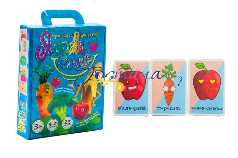 Настільна гра 'Яскраві емоції'. 55 карт - 50 емоцій і 5 джокерів у вигляді веселки. Гра розрахована на 2-6 гравців. Перший гравець робить свій хід, а другого необхідно відповісти картою з аналогічною емоцій, або джокером і відправити карти у відбій. Якщо вам нема чим відповісти на цей хід, забирайте карти собі, а перший гравець тягне відсутню карту з колоди.