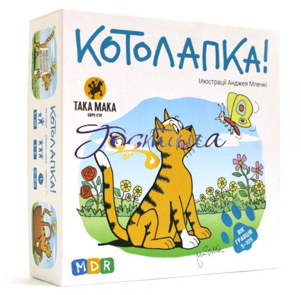 Серія  ігор “Сідай і Грай”. Не витрачай час на правила! Розважайся з сім’єю та друзями!  Метелик влаштував котику шалені перегони на галявині.  Уважно роздивись, прослідкуй за шляхом метелика і скажи, на що він сяде. Кричи: “Котолапка!”, якщо побачиш, що котик зловив метелика. Грай у гру «Котолапка» і тренуй спостережливість та швидкість реакції! Для кого гра? Гра буде цікавою дітям від шести років.Сімейна гра, яка буде одночасно цікавою батькам та дітям, вдома чи на відпочинку, адже це саме той випадок, коли діти мають великі шанси виграти у дорослих! Правила Уважно роздивись, прослідкуй за шляхом метелика і скажи, на що він сяде. Кричи: 'Котолапка!', якщо побачиш, що котик зловив метелика.