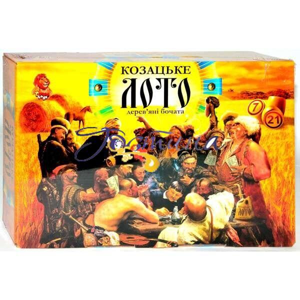 Склад настільної гри «Козацьке лото»:- 90 дерев'яних бочечків- 24 карти гравців- 100 фішок- тканинний мішечок