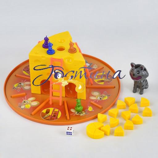 Настільна гра Fun Game «Полювання на сир» здатна наповнити сімейні вечори веселою атмосферою і азартом!Чотири невеликих мишки полюють на сир. Однак не так просто мишці дістати свій ласий шматочок, якщо за ним женеться величезний кіт.Ігрове поле складається з помаранчевої платформи з поділами по периметру і великим шматком сиру по центру. На кожному відділенні нанесені зображення, що визначають ходи гравців. Серед них є мишки з сиром, мишки, що віддають сир, сходи, а також місце для котика.Гра починається з верхівки сирної вежі, через отвір в якій кожен мишеня потрапляє на ігрове поле.Далі, в залежності від кількості кроків, який визначить кубик і значень на полі, гра буде розгортатися, підігріваючи інтерес учасників. Кожен буде отримувати або віддавати шматочки сиру, тікати від кота, підніматися по сходах і стрибати назад.Головна мета гри - зібрати 5 шматків сиру. Хто першим це зробить, не потрапивши в лапи кота, то і переміг!Комплектація:• 4 різнокольорових мишки;• 17 шматочків сиру;• Кіт;• Ігрова платформа;• Кубик.