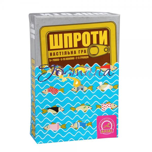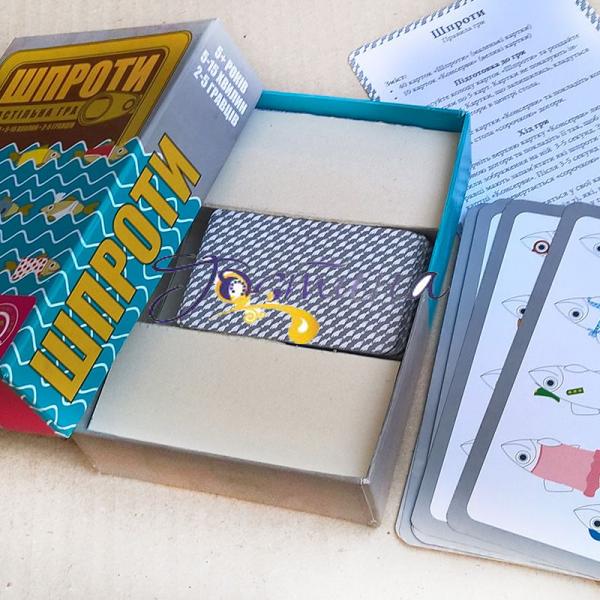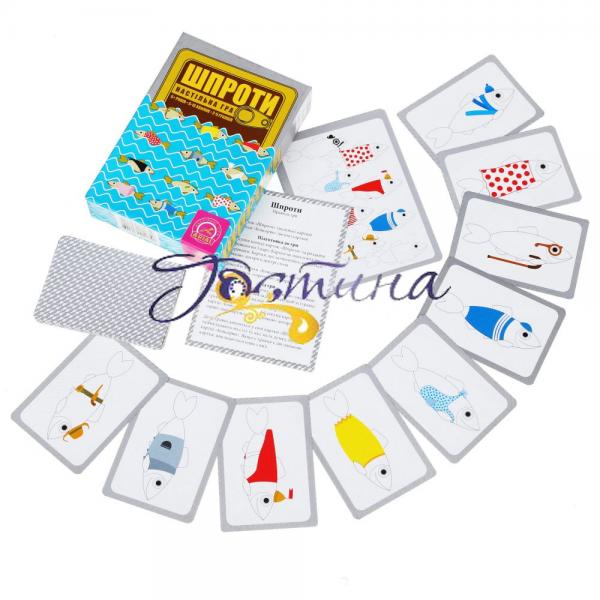 Шпроти — це дитяча гра в карти, що розвиває спостережливість та пам’ять. В грі є 2 типи карток — «Консерви» та «Риби». Картки «Риби» беруть гравці, а картки «Консерви» кладуться «сорочкою» догори посередині. Картка «Консерва» перевертається на декілька секунд. За цей час треба запам’ятати найбільше видів риб, що на ній зображені, та викласти свої картки з відповідними рибами. За помилково викладену картку (якої не було в «Консерві») штрафують.