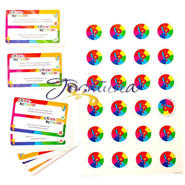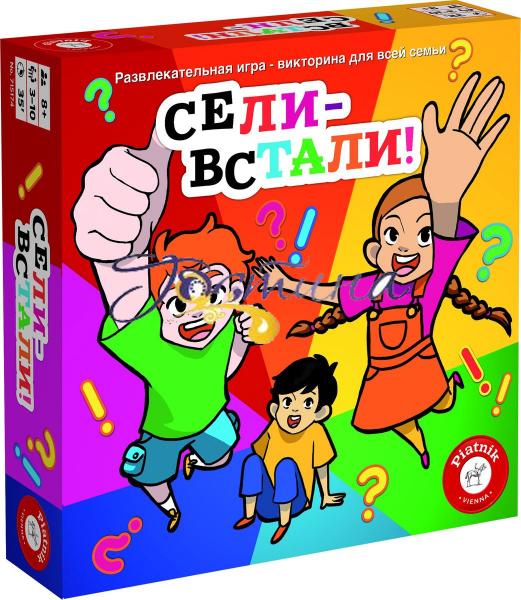 Інтелектуальний і фізична праця - і все в одній коробці.Відповідайте на питання, вибирайте відповіді: вставайте або сідаєте. Гравець, який правильно відповів на серію питань отримує виграшний жетон. Хто набрав найбільшу кількість жетонів - перемагає в грі.В комплекті більше 300 питань на різні теми (космос, мультики, книги, тварини, історія ...). Кількість гравців: 3-10 Ігровий час: близько 35 хв. Розмір коробки: 26 x 25 x 6 см Вік: 8 + рос мова