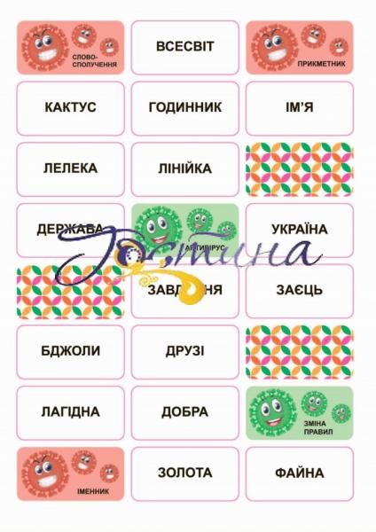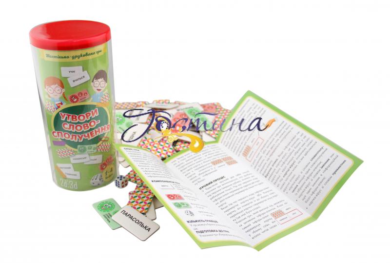 Мовна настільно-друкована гра 5 в 1 для вивчення мови поєднуючи за правилами іменники, прикметники і дієслова.