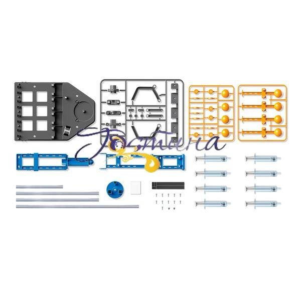 Розвиваючий набір Гідравлічна мегарука серії KidzLabs - це не тільки розвага, але і знайомство з такими науками, як фізика, гідравліка і робототехніка. Можливо, саме такий комплект викличе у дитини інтерес до подальшого вивчення наук. Комплектація: ручка x 4, кришка ручки, лівий кіготь, правий кіготь, роз'єм кігтя x 2, штифт x 3, стопор x 2, повзунок нижня частина, кришка шприца, верхня частина повзуна, шарнір шприца, тримач шприца, ковпачок голки x 6, ковпачок поршня x 7, ковпачок ручки x 4, підстава пластини, рама кігтя, що обертається рама, рама верхнього важеля, поворотна основа, циліндр шприца x 8, поршень шприца x 8, кіготь прокладки, довга труба, середня труба x 2, коротка труба, клейова лапка, маленький гвинт x 11, гвинт з плоскою вершиною x 2. Також потрібно (немає в комплекті): невелика хрестова викрутка, використана очищена бляшанка.