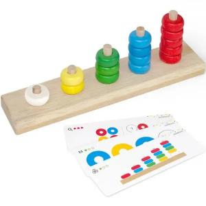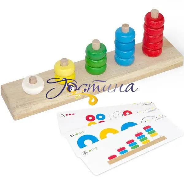 Іграшка містить 15 кілець різних кольорів, які потрібно нанизати на стержні у певному порядку від 1 до 5. Покажіть дитині, як це робити, а далі виконуйте задання з карток. Гра розвиває сенсорні здібності, дрібну моторику рук, координацію рухів, навички сортування, вміння рахувати у межах 15.