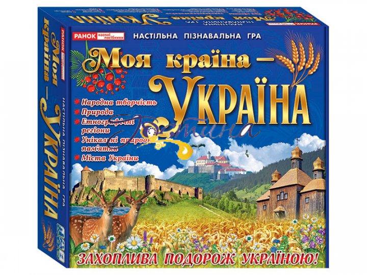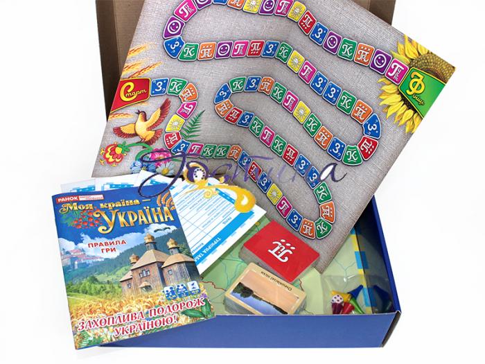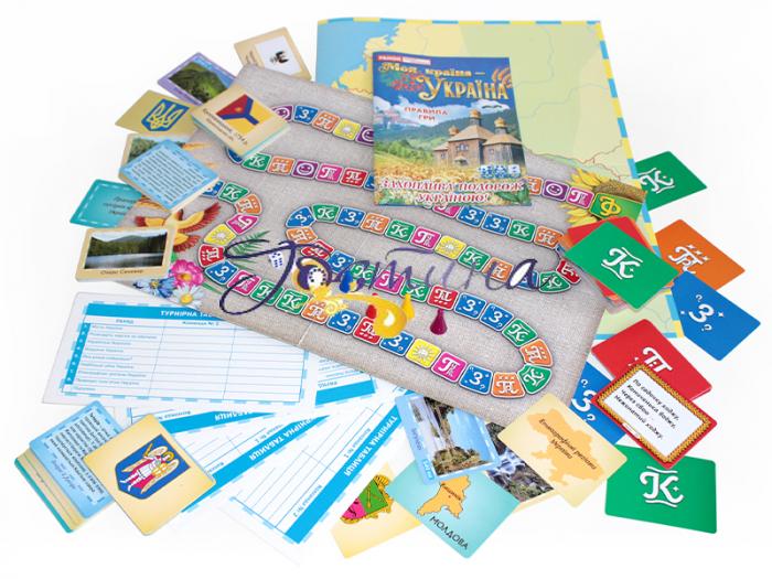 Настільна пізнавальна гра «Моя країна – Україна» знайомить з народною творчістю та природними скарбами Батьківщини. У наборі 2 різні варіанти гри з різними ігровими полями, надрукованими на цупкому картоні: з льняною текстурою з цікавими завданнями та поле-карта. Поле-карта буде корисним як для домашнього використання, так і у школі. На ній намальовані рельєфи, водойми, заповідники, кордони країни, тощо.