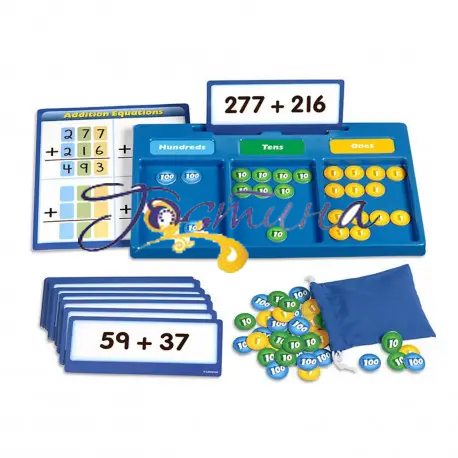 До комплекту входить сортувальний лоток, 75 фішок (одиниці позначені жовтим кольором, десятки – зеленим, сотні – блакитним), а також 40 карток із прикладами на дво- та тризначні числа.