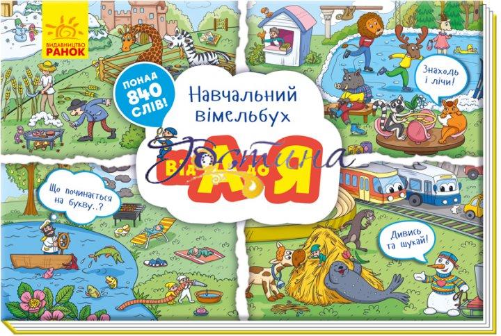 Навчальний віммельбух «Від А до Я» — це не тільки цікава книжка для розглядання, але й чудова абетка. На кожному її розвороті намальовано від 50 до 90 предметів для пошуку на зазначені букви. Також це чудовий привід зібратися всією родиною, роздивитися картинки, обговорити героїв і навіть позмагатися, шукаючи слова.