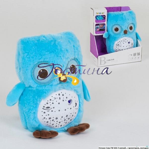 Нічник "Сова". М'який плюшевий нічник у вигляді сови. Грають заспокійливі, релаксуючі мелодії; проекція нічного неба. Працює від батарейок. Бренд: Funmuch Упаковка: Коробка Колір: Блакитний Тип ел-тів харчування: Батарейки (ААА) Кількість елементів харчування: 3 Елементи живлення в комплекті. Габарити в упаковці: 27 x 23 x 12 см Матеріал: Комбінований