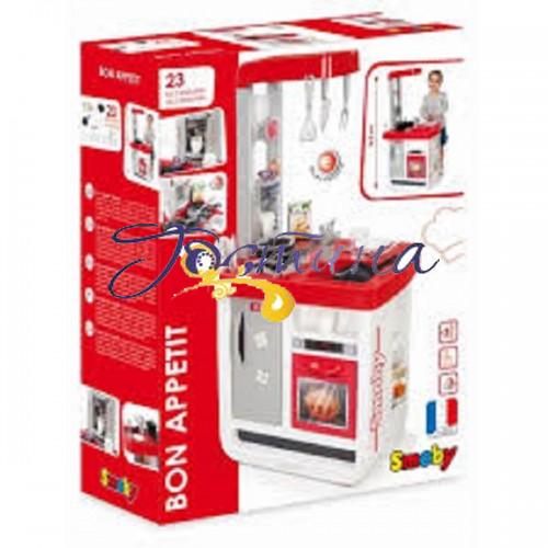 Інтерактивна кухня Smoby Bon Appetit Red зі звуковими ефектами і аксесуарами (310800) Ваш маленький шеф-кухар буде в захваті від інтерактивної кухні        Bon Appetit Red        від одного з найвідоміших французьких виробників іграшок        Smoby. Добре обладнана, компактна і реалістична кухня з 2-х конфорочной плитою, духовкою, холодильником, раковиною з краном і кава-машиною. Двері духовки і холодильника відкриваються. Великий асортимент аксесуарів можна розмістити на численних полицях. Під час гри видає звукові сигнали, що імітують приготування їжі. Сучасна кухня Bon Appetit Smoby зі стільницею стане відмінним розвагою для дівчинки і для хлопчика, допоможе розвитку вашої дитини і навчить його пристосовуватися до самостійного життя. А сам дитина буде відчувати себе справжнім маминим помічником і юним кухарем. У комплект входить 23 аксесуара: посуд на дві персони (тарілка, ложка, виделка, ніж, склянка і чашка) каструля з кришкою і сковорода кухонне приладдя для приготування їжі кавові таблетки коробочки для продуктів харчування Іграшка виготовлена ??з екологічно чистих і безпечних матеріалів з усіма необхідними вимогами. Рекомендовано дітям від 3 років. Розмір (Д x Ш x В): 52 х 34 х 97 см