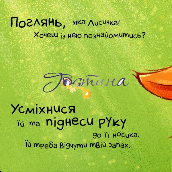 З цiєю книжкою можна грати по-рiзному: крутити, трясти, качати, навiть дути на неї i гладити. Дитина буде брати активну участь в iсторi та взаємодiяти з головним героєм книжки на кожному розворотi. Лисеня просить подути й остудити молочко, Їжачок – струсити грушi з дерева, Ведмедик – покачати лiжечко, щоб вiн швидше заснув, а Мишеня потрiбно сховати вiд кiшки. Нехай знайомство з контактною книжкою буде приємним!