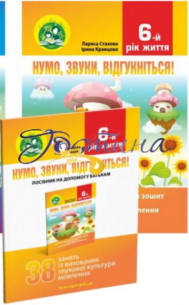 Домашній логопедичний зошит містить ілюстровану артикуляційну гімнастику та різноманітні цікаві завдання у яскравих малюнках. Поради щодо виконання усіх завдань подано у посібникові на допомогу батькам “Нумо, звуки, відгукніться! 38 занять із виховання звукової культури мовлення дітей шостого року життя”.