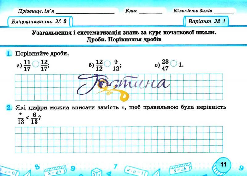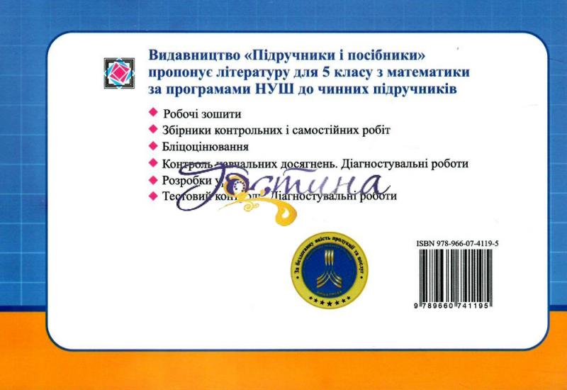 Посібник призначений для поточного контролю навчальних досягнень учнів 5 класу, які вивчають математику за модельною навчальною програмою «Математика. 5-6 класи» та підручником «Математика. 5 клас» (авт. А. Г. Мерзляк та ін.). Він містить 35 відривних карток у двох варіантах. Орієнтовний час для роботи з ними — 10 хв. Кількість завдань з кожної картки і систему їх оцінювання учитель / учителька може вибирати самостійно, орієнтуючись на рівень навчальних досягнень учнів.