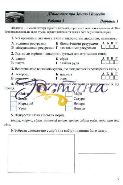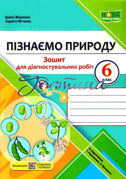 Посібник містить завдання для тематичного оцінювання навчальних досягнень учнів із предмета «Пізнаємо природу» в 6 класі, яке здійснюють письмово у формі комбінованої діагностувальної роботи наприкінці вивчення кожного розділу. Завдання складено у двох варіантах відповідно до модельної навчальної програми «Пізнаємо природу. 5–6 класи» (авт. Т. Коршевнюк) та підручника інтегрованого курсу «Пізнаємо природу» для 6 класу закладів загальної середньої освіти (авт Т. Коршевнюк, О. Ярошенко). Усі завдання учні виконують безпосередньо в зошиті.