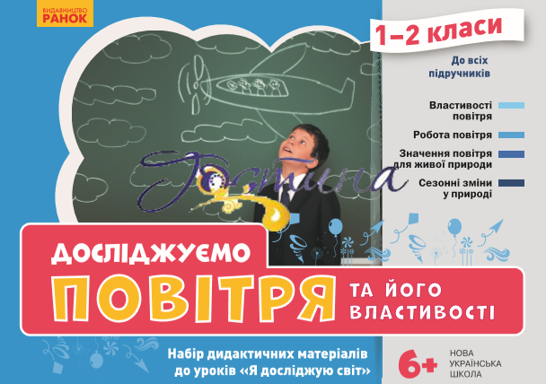 «Досліджуємо повітря та його властивості» — один з наборів дидактичних матеріалів, що входить до серії «Досліджуємо світ природи». Набір створено для введення дитини у світ науки в цікавій ігровій формі, набуття нею досвіду перших відкриттів у світі природи, пошуку відповідей на численні «чому?». Набір дидактичних матеріалів не тільки зацікавить дітей та вчителів, але й стане помічником на уроках і в сімейних розвагах та дитячих іграх.