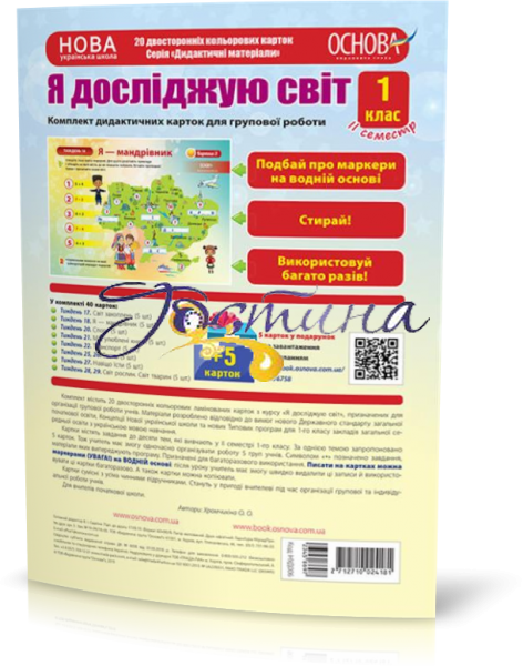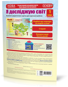 Комплект містить 20 двосторонніх карток формату А4 до курсу «Я досліджую світ» у 1-му класі НУШ (ІІ семестр). + 5 БЕЗКОШТОВНИХ карток у подарунок, які можна завантажити за допомогою QR-коду, зазначеного на обкладинці.