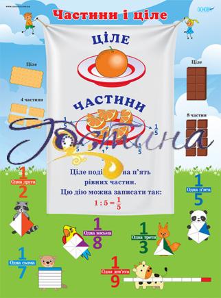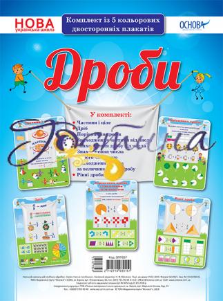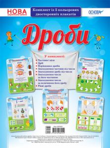 Комплект із 5 кольорових двосторонніх плакатів.Вчителі початкових класів (1-4 класи).Плакати розроблено у відповідності до Концепції НУШ.Плакати містять наочні приклади, що допоможуть полегшити процес вивчення та запам’ятовування дробів у початкових класах.Плакати розроблено, як наочний посібник до робочого зошита «Я вивчаю дроби» серії «Життєві навички», та можуть бути використані як у комплексі так і окремо. Частини і ціле Дроби Порівняння дробів Знаходження частини від числа Знаходження дробу від числа Знаходження числа за його частиною Знаходження числа за величиною його дробу Рівні дроби