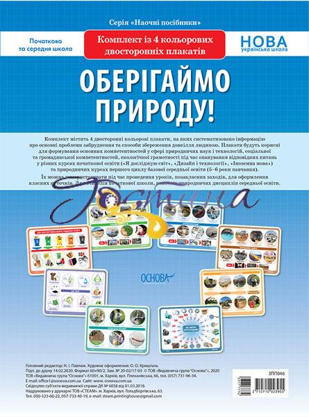 Комплект містить 4 двосторонні кольорові плакати, на яких систематизовано інформацію про основні проблеми забруднення та способи збереження довкілля людиною: