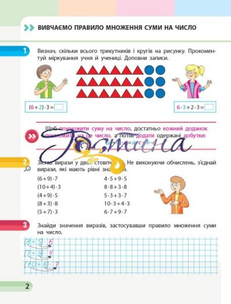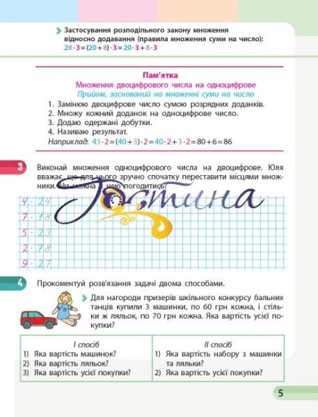 Посібник складений відповідно до Типової освітньої програми, розробленої під керівництвом О. Я. Савченко, і є складовою навчально-методичного комплексу з математики для 3 класу авторів С. О. Скворцової, О. В. Онопрієнко. До комплексу входять: навчальний зошит у 4 частинах із додатком «Працюю самостійно» для самостійної роботи учнів, посібник «Моніторинг навчальних досягнень», збірник завдань для формувального оцінювання, розробки уроків. Видання складається із чотирьох частин, кожна з яких містить тексти правил; зразки міркувань; завдання на актуалізацію опорних знань, створення проблемної ситуації та ї ї розв’язання, первинне закріплення, формування вмінь і навичок, неперервне повторення. Навчальний матеріал поданий з урахуванням психологічних особливостей сучасних третьокласників.