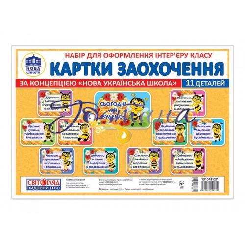 В комплекті 11 окремих яскравих елементів з зображеннями веселих геометричних бджілок та мотиваційними написами, вирубані по два з аркуша форматом А4. Всі вони зображені на фото. Формат: 215х310 мм.