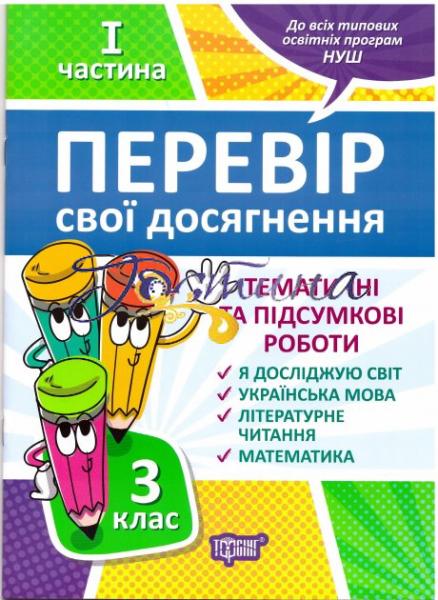 і проведення тематичного оцінювання навчальних досягнень учнів другого класу з предметів «Я досліджую світ», «Українська мова та читання», «Математика». Посібник містить також завдання для підсумкової контрольної роботи наприкінці навчального року. Зміст посібника «Перевір свої досягнення 3 клас. I і II частина» складено у відповідності з Державним стандартом початкової освіти та типових освітніх програм початкової школи.