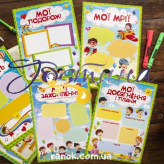 В наборі швидкозшивач з 12 аркушами за темами:? Знайомтеся: це я? Моя сім’я? Мої фотографії? Я живу? Моя школа? Режим дня? Мої успіхи у навчанні? Моя творчість? Мої захоплення? Мої досягнення і плани? Мої подорожі? Мої мрії