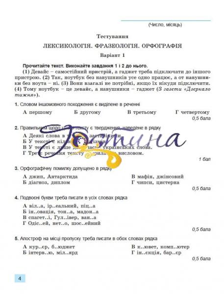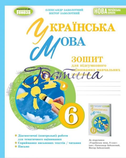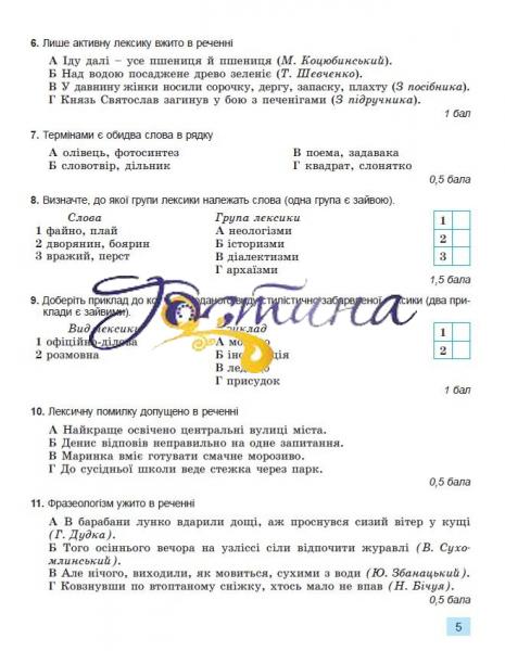 Посібник містить діагностичні (контрольні роботи), за допомогою яких можна оцінити навчальні досягнення учнів та учениць з української мови. Кожна робота для тематичного оцінювання складається з 15 завдань різного виду і подана у двох варіантах. Біля завдань указано максимально можливу кількість балів за виконання. Для перевірки правописних навичок у зошиті передбачено місце для диктантів. Для оцінювання вміння логічно й зрозуміло викладати думки, доречно вживати слова, грамотно писати учням та ученицям пропонується написати перекази та твір. Крім оцінювання роботи за 12-бальною шкалою, учитель / учителька може висловити загальне враження від діяльності учнів / учениць. Для цього в кінці кожної роботи запропоновано словесні характеристики, біля яких учитель / учителька за бажанням поставить одну або кілька позначок.