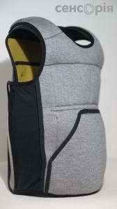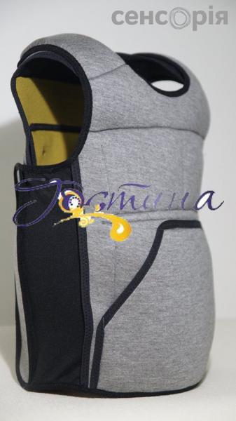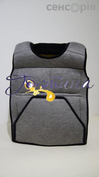 Обтяжений тиснучий жилет з неопрену.Завдання жилета - забезпечити додаткове сенсорне навантаження, підвищити рівень пропріоцептивної чутливості. Як результат - ефект “зазамлення”, відчуття себе в просторі, зниження рівня тривожності, стресу, підвищення концентрації.