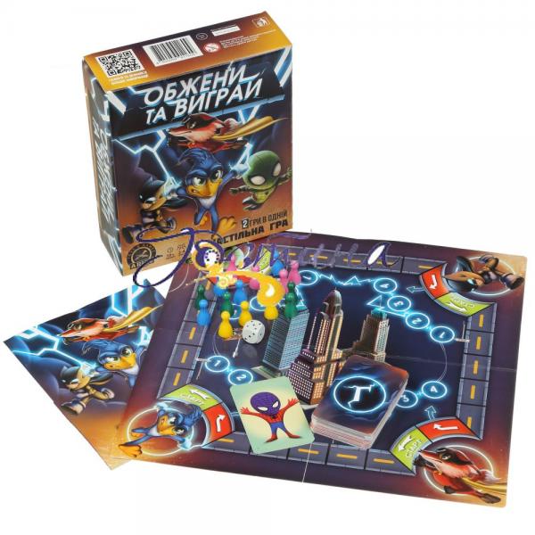 Комплектація: ігрове поле, 16 ігрових фішок, кубик, комплект карток і правила гри.