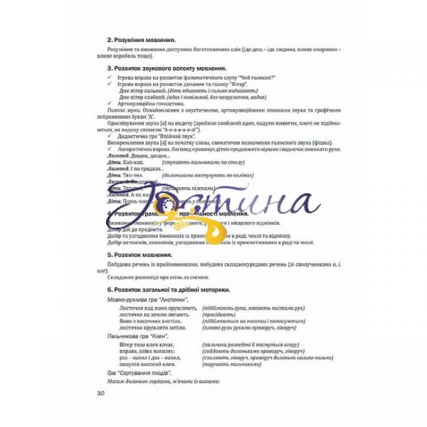 У посібнику визначено найефективніші методи, прийоми та засоби, спрямовані на реалізацію розвиткових, навчальних і виховних завдань. До запланованих занять дібрано практичний матеріал: рухливі, дидактичні, логоритмічні, пальчикові, мовно-рухові ігри, художні твори.