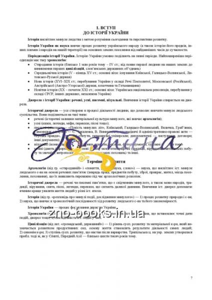 Пропонований посібник призначено для самостійної підготовки до ЗНО НМТ і ДПА з історії України, а також для поурочної роботи. Він укладений відповідно до чинної програми з історії України для закладів загальної середньої освіти та чинної програми ЗНО. У виданні представлено теоретичні відомості, різноманітні словниково-довідкові й інші допоміжні матеріали та тестові завдання з історії України (від найдавніших часів до наших днів) з відповідями, що дають змогу здійснити перевірку знань, умінь і навичок з цього курсу.