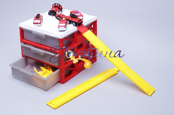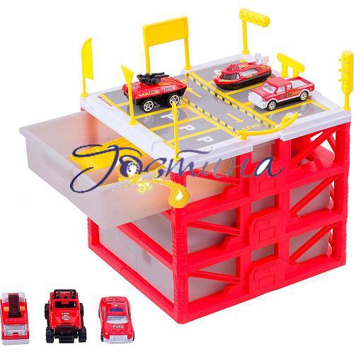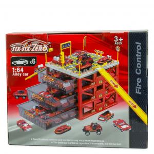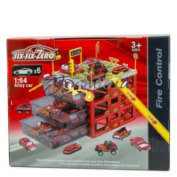 Парковка "six-six-Zero", 4 рівня. Великий паркінг для пожежної техніки. Він включає в себе 6 машинок, паркінг з 4-я поверхами і крутими спусками. Машинки металеві. Масштаб - 1:64. З даним набором дитина зможе грати в різні сюжетно-рольові ігри.