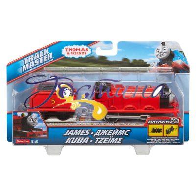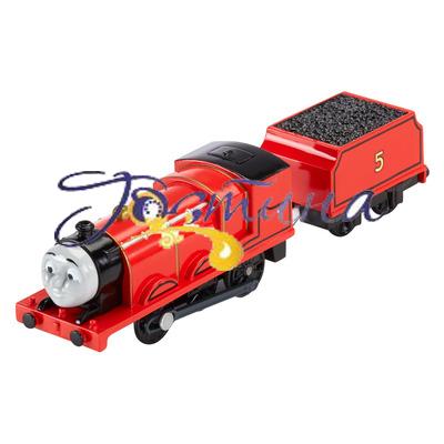 Моторизований потяг 'Джеймс з вагоном' - довгий паровозик червоного кольору з шістьма колесами.