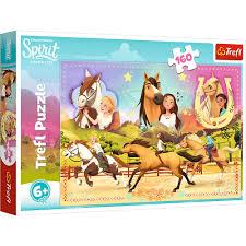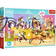 Пазли на 160 елементів із зображенням головних персонажів нового американського мультсеріалу 'Спірит: Стрибки на волі', який є продовженням знаменитого мультфільму 2002 року 'Спіріт: Душа прерій'. У складеному вигляді розмір картинки становить 41х28 см.Тематика Мультиплікація Вік від 5-ти років Розмір картинки 41х28 см Вага 0,32 кг Розмір коробки 29х19х4 см