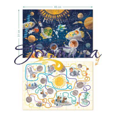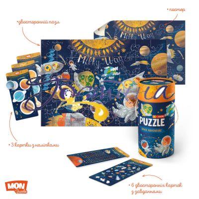 Пазл та гра від нового бренду Mon puzzle Двостороння навчальна пазл-гра «Космічна пригода» познайомить малюка з будовою Сонячної системи, різні завдання на картках обов'язково захоплять дитину і сформують перші уявлення про астрономію.  Пазл призначений для малюків від трьох років, але діти молодшого віку можуть для початку спостерігати, слухати, розглядати і грати з елементами.  Для безпеки малюка ми робимо елементи пазла зі щільного картону, великими і з закругленими кутами.  Пазл-гра тренує:   - Просторове мислення  - Дрібну моторику  - Пам'ять  - Логіку  - Творчі навички  - Посидючість  Вік: від 3-х років? Комплектація: 1 двосторонній пазл, 1 двосторонній постер, 3 картки із наліпками, 6 карток із завданнями Кількість елементів: 40 Розмір пазла: 31х45 см