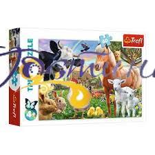 Пазли на 60 елементів з гарним зображенням кроликів, ягнят, курей, коники та інших домашніх тварин, які мешкають на фермі. У складеному вигляді розмір картинки складає 22х33 див. Висока якість, насиченість кольорів і безпеку при збиранні пазлів забезпечує спеціальний каландрировані картон, який відбиває світло і покритий екологічними фарбами.