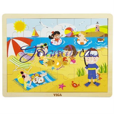 Дерев'яний пазл складається з 24 елементів, з яких можна зібрати тематичну картинку з відповідним сезоном. Малюнок пазла завдано також на дерев'яну підкладку: дитина може використовувати її в якості підказки.