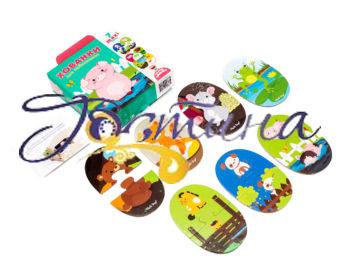 Покладіть перед малюком деталь із зображенням тварини. Запитайте: «Де ховається порося?». Клац! Пазл склався. Дитина легко визначає, що порося гріє боки на сонці в калюжі, і добирає потрібну деталь. Тепер перевіримо! Перегорніть пазл, якщо малюк зробив правильний вибір, він побачить тваринку в її будиночку. Дитина відшукає всіх тварин та оселить їх у будиночках.