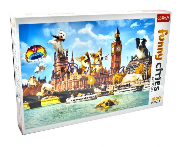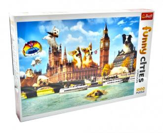 Funny Cities - це серія гумористичних пазлів, яка пропонує в жартівливому тоні подивитися на всім відомі і улюблені міста. "Собаки в Лондоні" зі згаданої серії "Кумедних міст" - це пазли на 1000 елементів, після складання яких ми отримаємо картинку розміром 68х48 див. З веселим зображенням декількох чарівних собачок різних порід посеред Лондона. Високу якість, насиченість кольорів і безпеку при складанні пазлів забезпечує спеціальний каландрований картон, який відбиває світло і покрить екологічними фарбами.