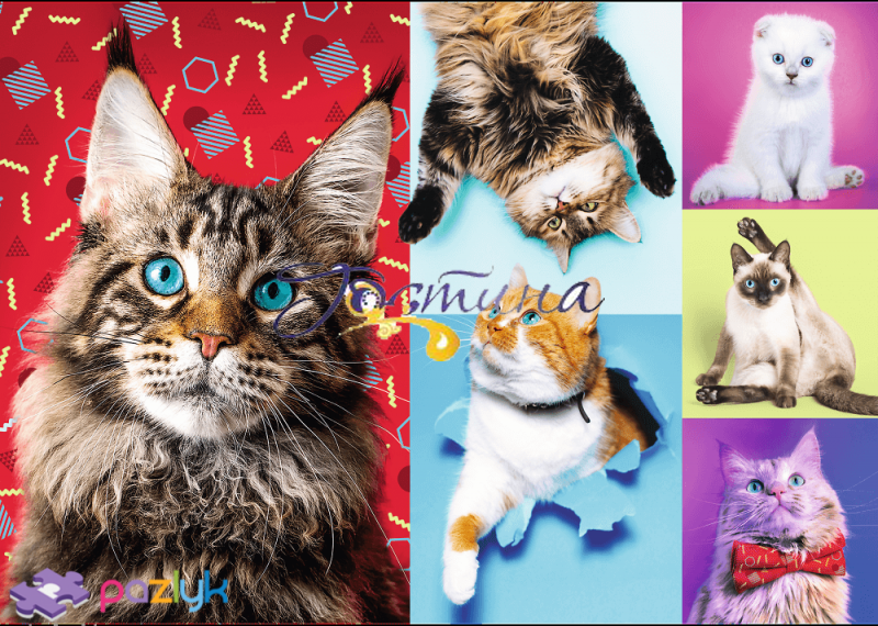 Збирання пазлів - чудове заняття для дітей і дорослих будь-якого віку. Це захоплюючий процес, який позитивно впливає на кмітливість, уважність і логічне мислення кожного учасника дійства. Майстри бренду Trefl створили неймовірну колекцію барвистих пазлів, в якій знайдеться цікавий малюнок для будь-якого охочого вирішити головоломку.Пазли на 1000 елементів з кумедним зображенням різних котиків. У складеному вигляді розмір картинки становить 68х48 см. Висока якість, насиченість кольорів і безпеку при збиранні пазлів забезпечує спеціальний каландрований картон, який відображає світло і покритий екологічними фарбами.