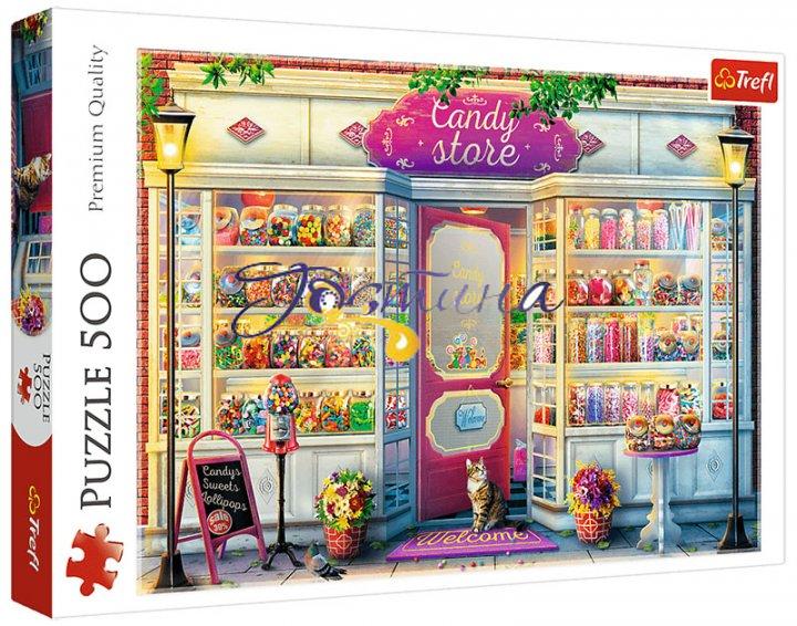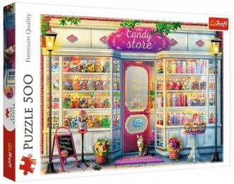 Пазли на 500 елементів із зображенням вітрини маленького магазину зі смачними солодощами.