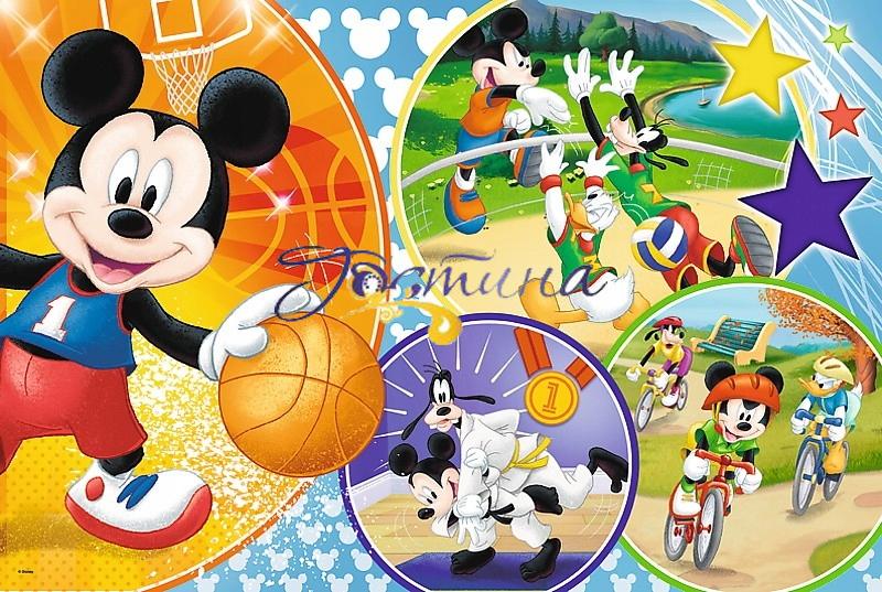 Пазли Максі на 24 елементи із зображенням культових героїв мультиплікаційного серіалу Уолта Діснея «Міккі Маус та друзі» під час спортивних занять. У складеному вигляді розмір картинки становить 60х40 см.