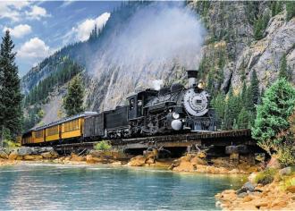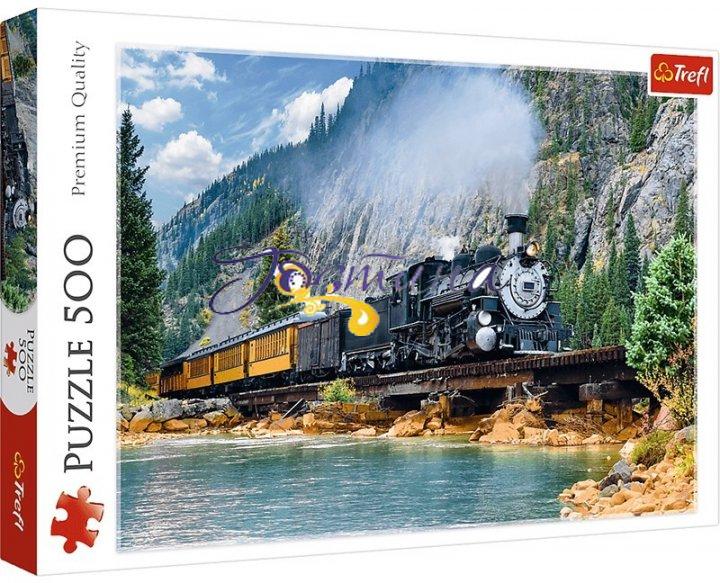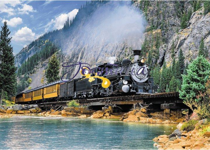 Пазли на 500 елементів із зображенням старовинного потягу, що мчить посеред величних гір. У складеному вигляді розмір картинки становить 48х34 див.